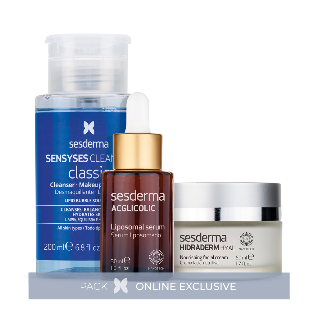 This pack combines the power of SENSYSES Classic, ACGLICOLIC Liposomal Serum, and HIDRADERM Hyal nourishing cream to moisturize even the driest skin.