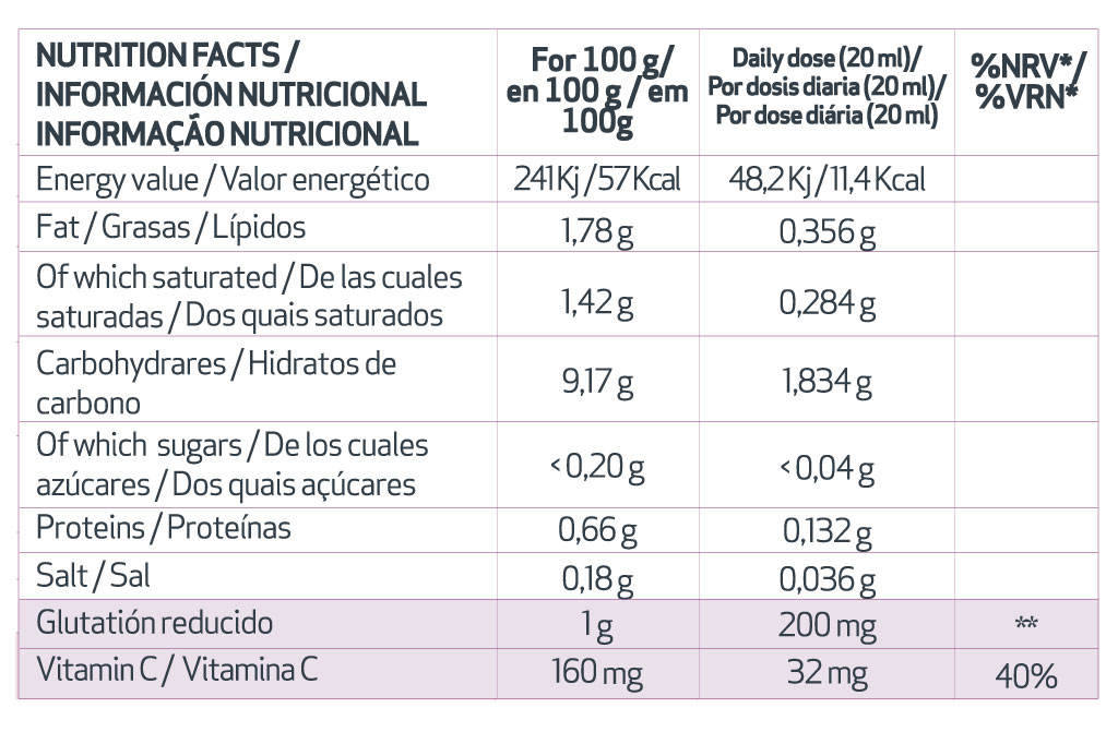 AGUA, ESTABILIZANTE: (E-422) GLICERINA; EMULGENTE: (E-322) LECITINA DE SOJA; ALCOHOL, EMULGENTE: (E-432) MONOLAURATO DE SORBITANO POLIOXIETILENADO; GLUTATIÓN REDUCIDO, AROMA DE MANGO, AROMA DE LIMÓN, AROMA DE PIÑA, VITAMINA C (ÁCIDO L-ASCÓRBICO), ANTIOXIDANTE: (E-330) ÁCIDO CÍTRICO; CONSERVANTES: (E-202) SORBATO POTÁSICO, (E-211) BENZOATO SÓDICO; CORRECTOR DE ACIDEZ: (E-524) HIDRÓXIDO DE SODIO; EDULCORANTES: (E-960) GLICÓSIDOS DE STEVIOL 95%, (E-955) SUCRALOSA; ESPESANTE (E-415) GOMA XANTANA.
