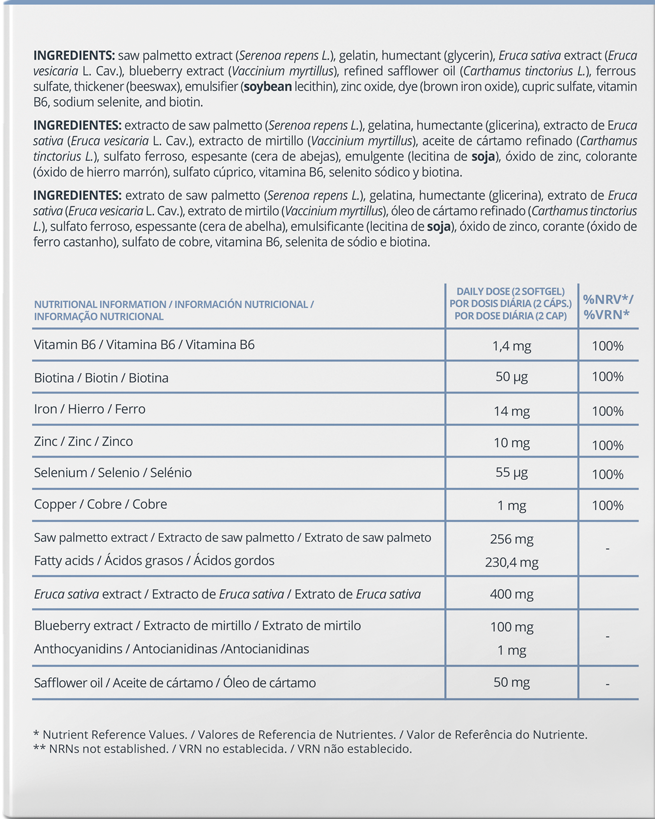 Complemento alimenticio a base de vitaminas e ingredientes específicos para el cuidado del cabello como Serenoa repens, Eruca sativa, hierro, zinc y biotina, entre otros.